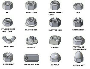 | NUTS | All Sizes for respective bolts | Hex Nut (Hexagon Nut) DIN 439/934/936, DIN 6330/6915, ISO 4032/33 /4166/ 8673 JIS,UNI, EN, ANSI/ASME B18.2.2, Slotted Hex Nut (Castle Nut) DIN935/937, JIS B1170, ANSI/ASME B18.2.2, ANSI/ASME B18.2.4.3M Hex Flange Nut DIN 6923/25/26/27/28 Nylon Insert Lock Hex Nut DIN985/982, DIN6924, Square Nut DIN 557/562/798, ANSI/ASME B18.10, ASME/ANSI B 18.2.2 Wing Nut DIN314/15/16, ASME/ANSI B 18.6.9 | ![]() |